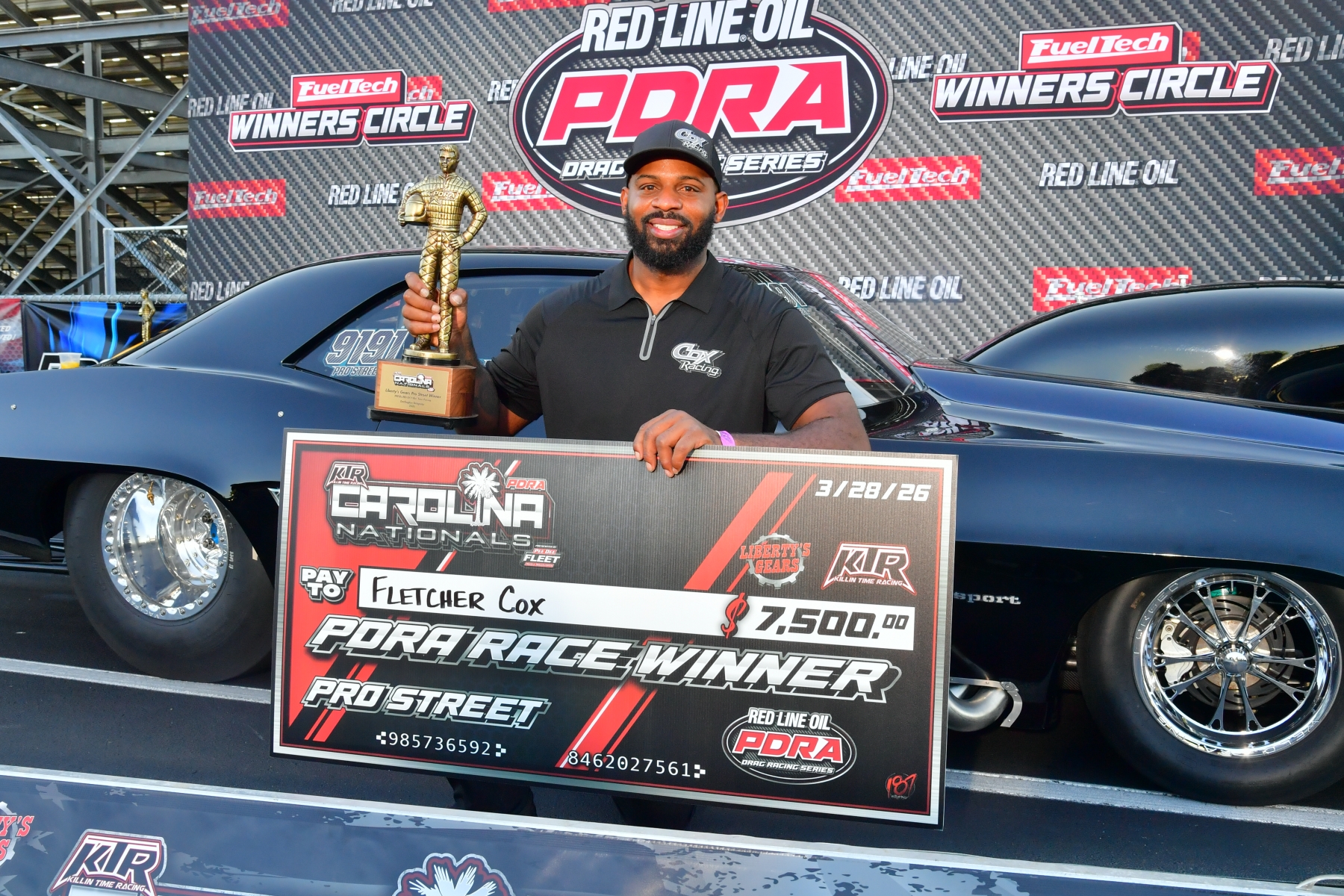 Last fall, retired NFL star Fletcher Cox earned his first career win as a driver in Pro Street at the PDRA Thunder Valley Throwdown, which was rained out at Bristol Dragway and completed at Darana Motorsports Park – Benson, NC during DragWars. His second career win came in similar fashion Thursday night, as he beat Jerry Morgano in the final round of the postponed Carolina Nationals that started at Darlington and wrapped up at Darana. He used a 4.020 to defeat Joel Wensley Jr. in the semifinals, then left on Jerry Morgano and ran a 3.967 at 188.96 in his Phil Shuler-tuned, nitrous-fed “Training Day” ’69 Camaro to beat Morgano’s 3.955 on a holeshot.