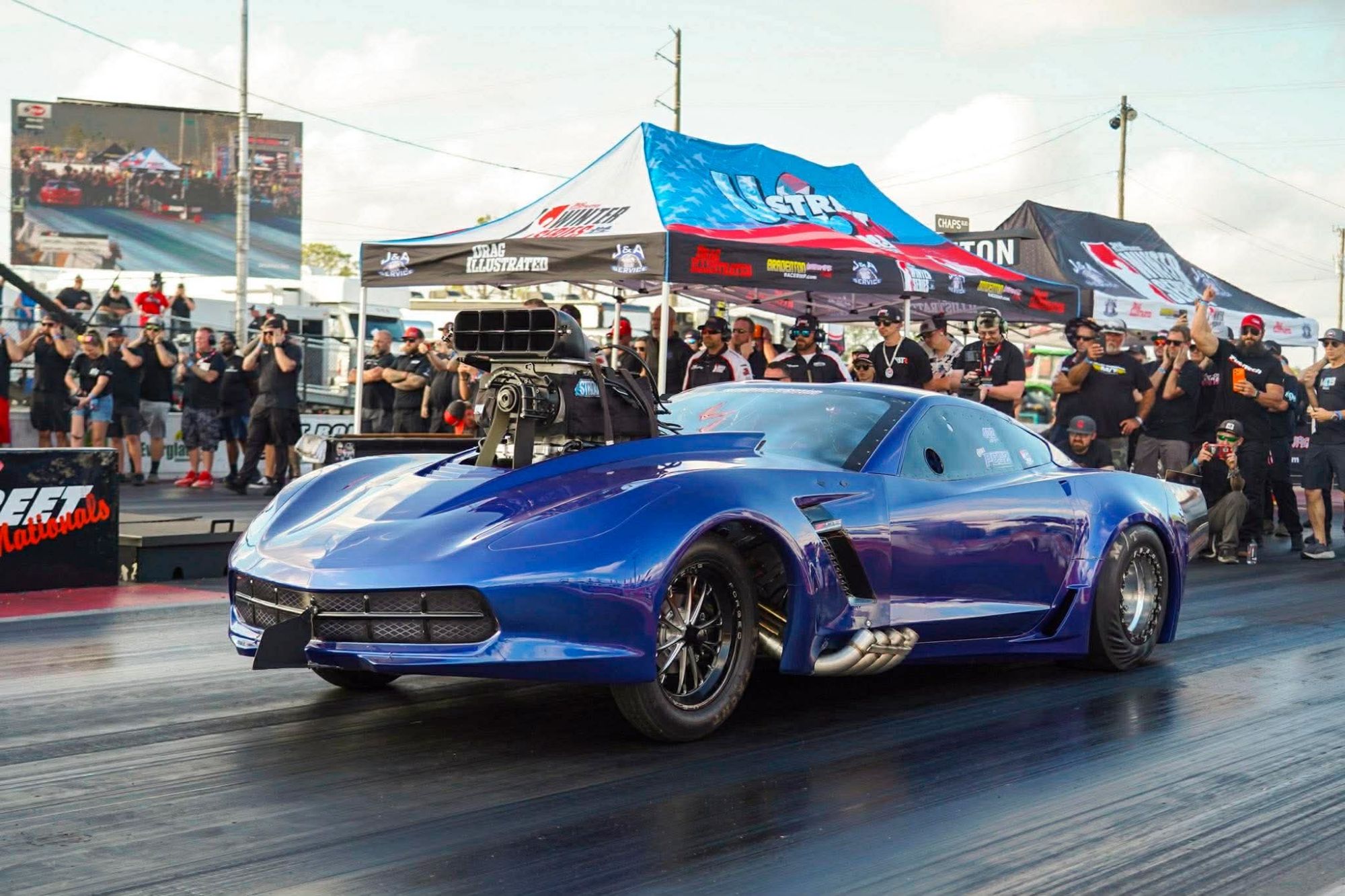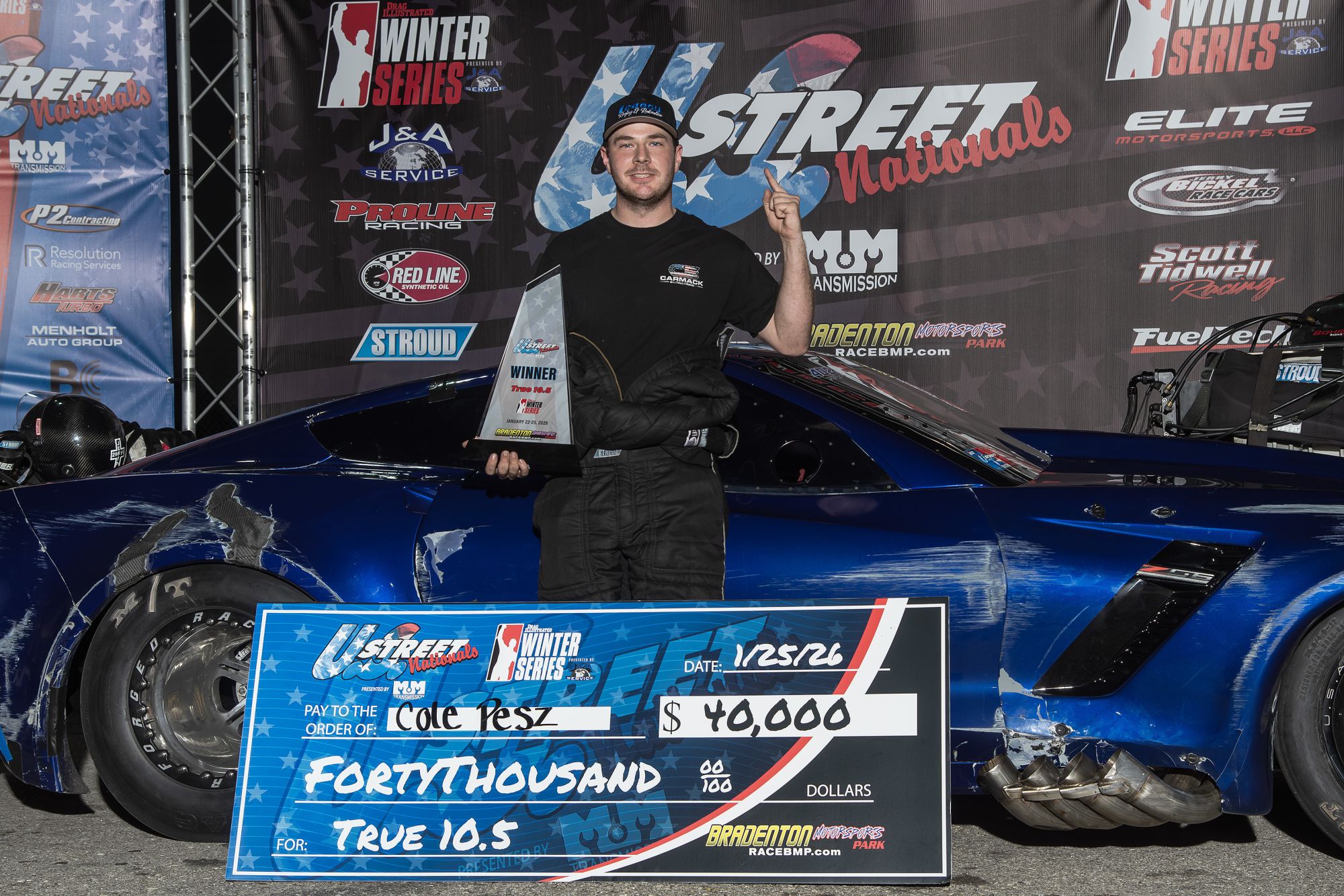 In what was undoubtedly the greatest example of perseverance at the U.S. Street Nationals presented by M&M Transmission, Cole Pesz went from the doctor’s office to the winner’s circle at Bradenton Motorsports Park. Just a few days after crashing the screw-blown ‘18 Corvette owned by Mark Gobert during pre-race testing, Pesz navigated five grueling rounds in the $40,000-to-win True 10.5 class at the Drag Illustrated Winter Series presented by J&A Service.
