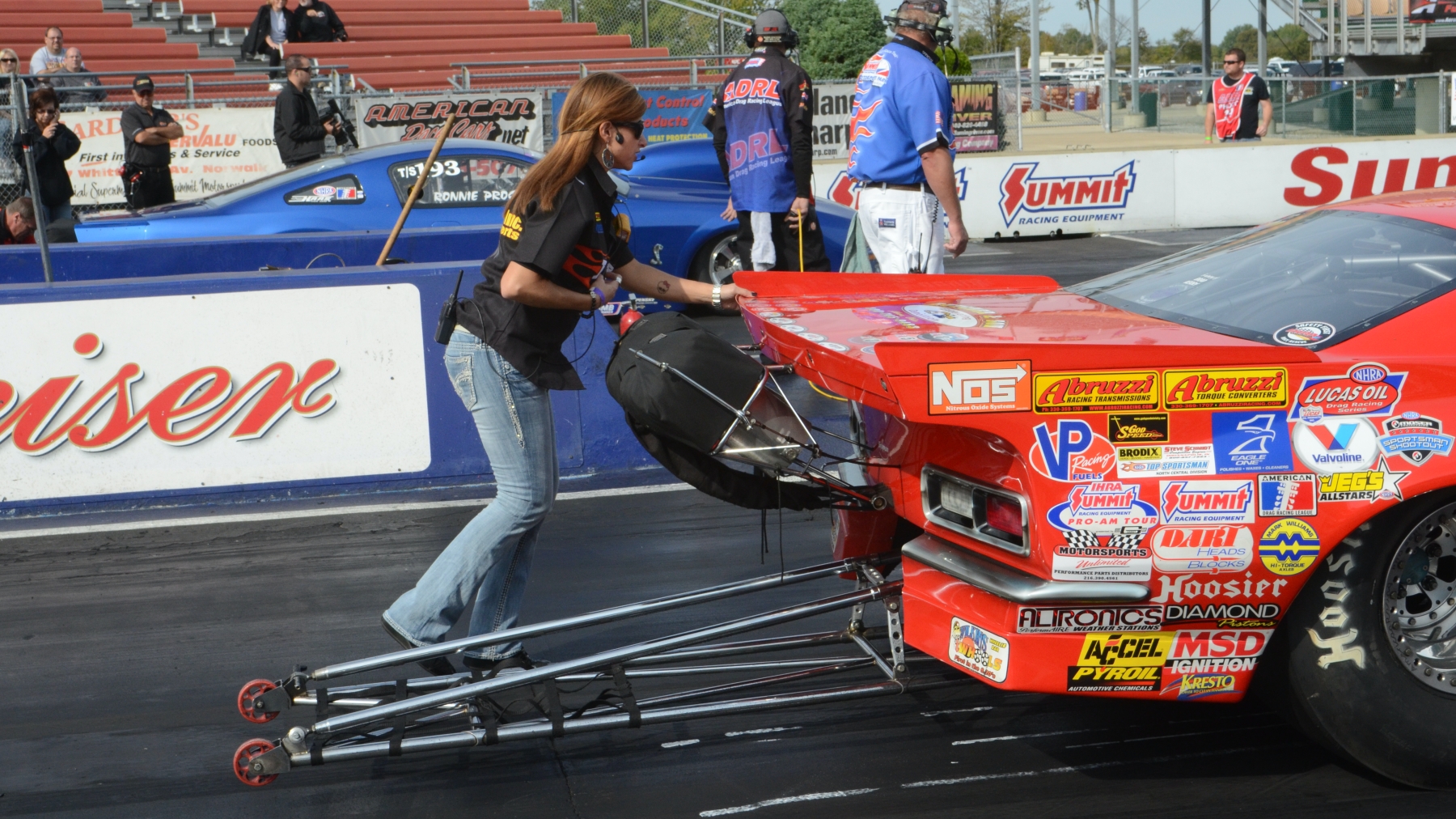 “And I don’t make it easy,” he admits. “They say it looks like I’m trying to run for president of Top Sportsman sometimes, because once we get to the lanes I like to talk. I walk up through the lanes and I’m looking and talking to people and she’s back with the car, without a driver, still maintaining the bottles and the tire pressures and everything else, and I’m up there fist pumping guys and talking and checking out the racing surface and this and that.