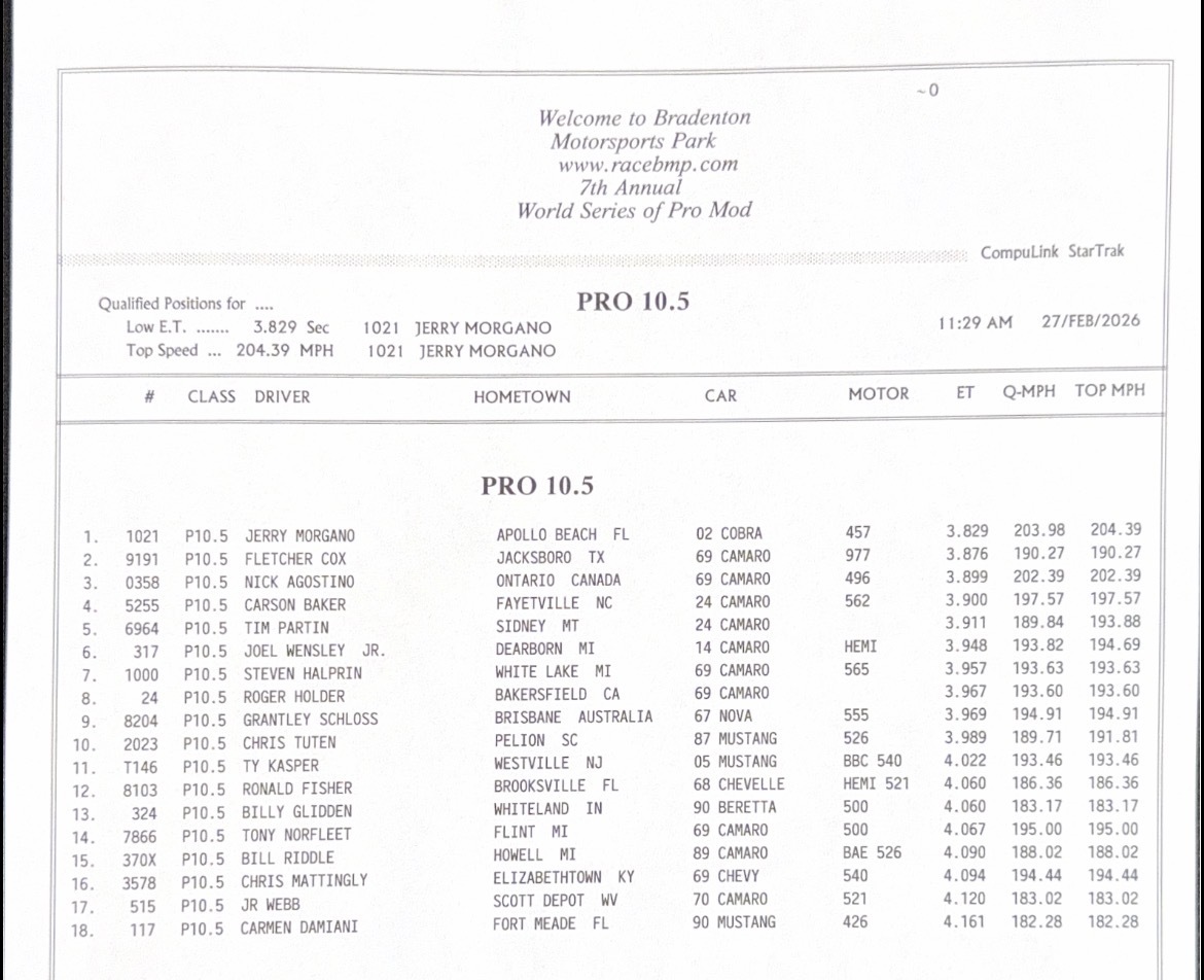 Qualifying continues Friday at the Drag Illustrated World Series of Pro Mod presented by Red Line Oil at Bradenton Motorsports Park, the third and final race of the 2025/2026 Drag Illustrated Winter Series presented by J&A Service.