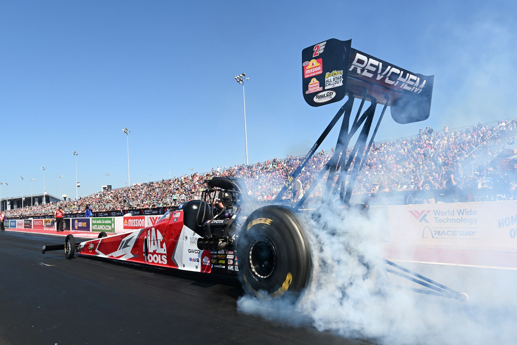 “Each of the rounds today, my car was just on a rail. That’s really what it took,” Kalitta said. “Conditions were pretty slick out there, just going A to B, and and this whole Mac Tools group, I’m just real proud of them. For me, it’s just a huge relief. You’re in the Countdown races trying to do your best and they’re giving you a car that’s going down the track like that, it’s real special for sure.
