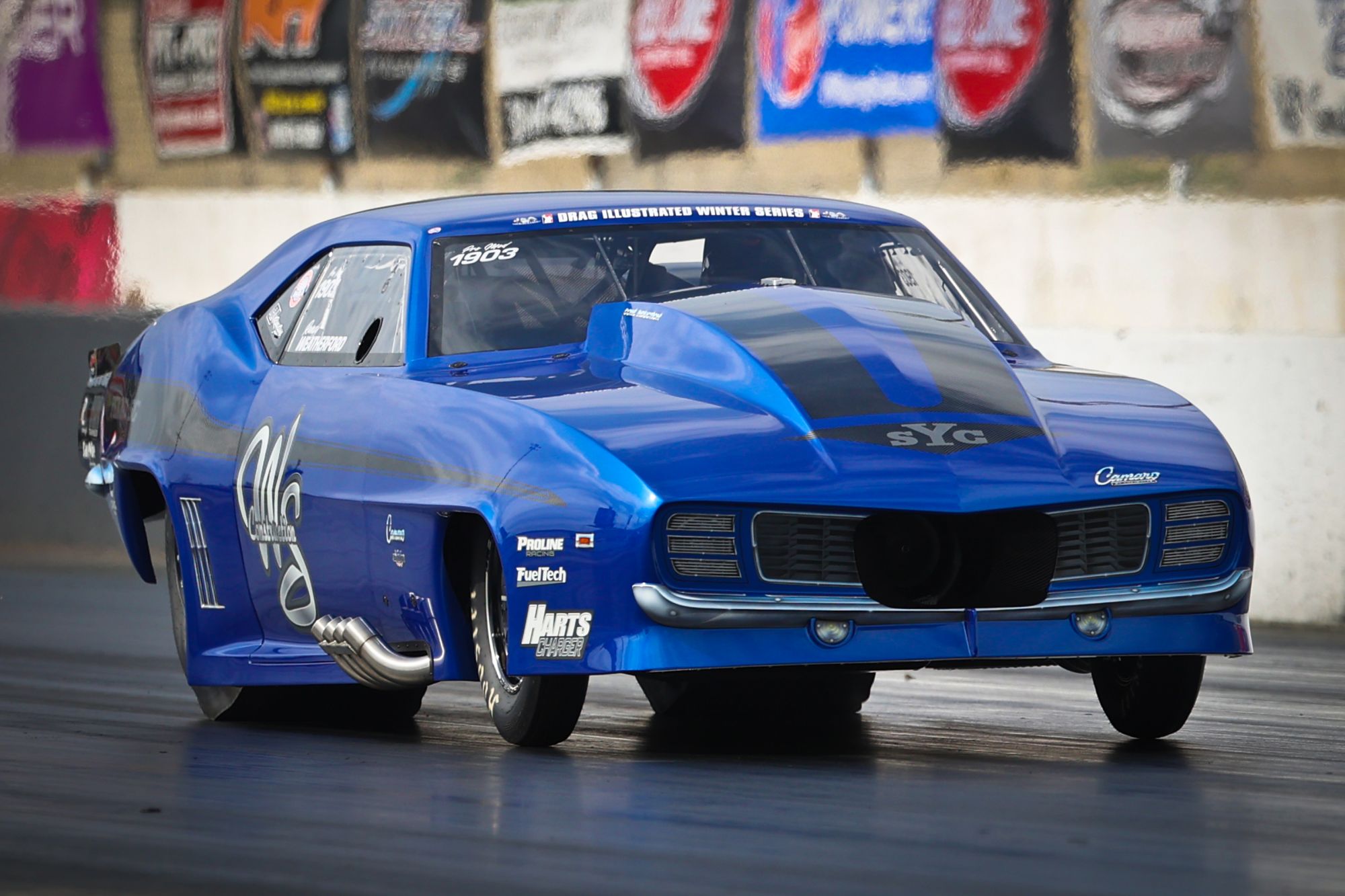Though Carolina Nationals qualifying didn’t benefit from the cool conditions typical of the season opener, Randy Weatherford and team proved that the Pro Boost E.T. record isn’t safe this weekend. Under the lights at Darlington Dragway, Weatherford in his Harts Charger-boosted WS Construction ’69 Camaro dipped below the current record, 3.555, with his 3.543 at 212.26 to highlight the final qualifying session.